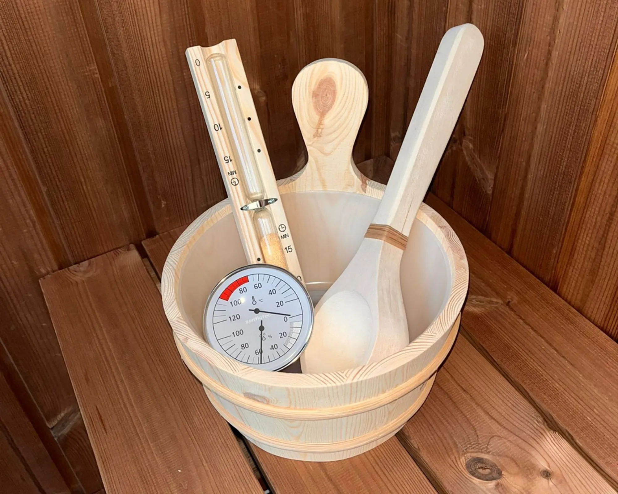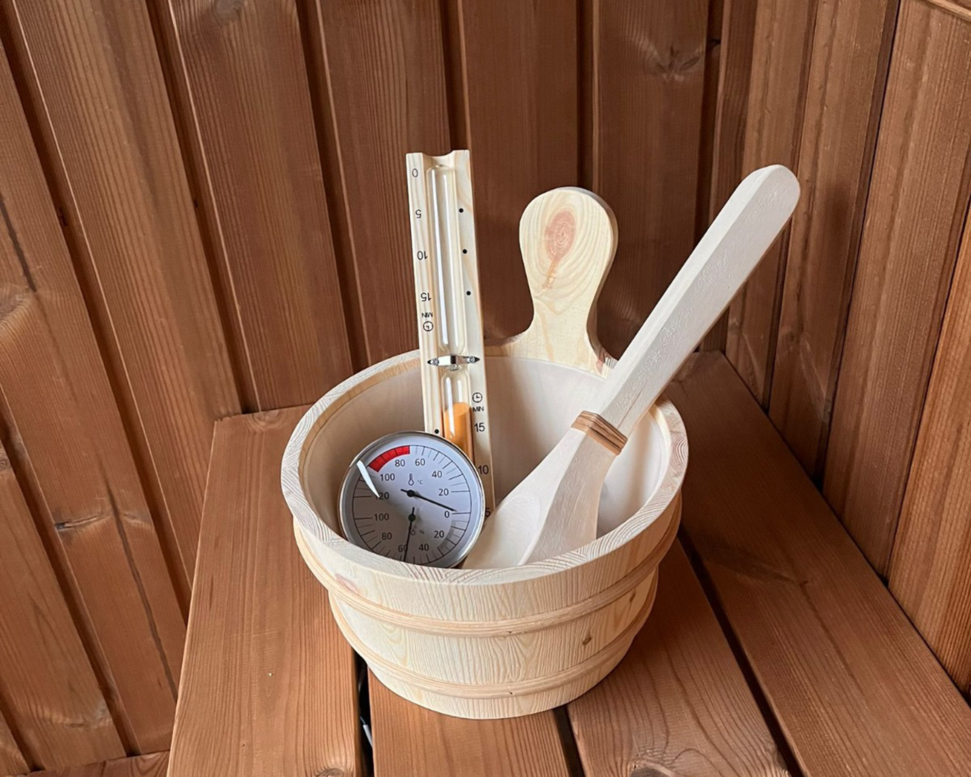 Každá součást setu Vám pomůže, abyste si pobyt v sauně ještě více užili.