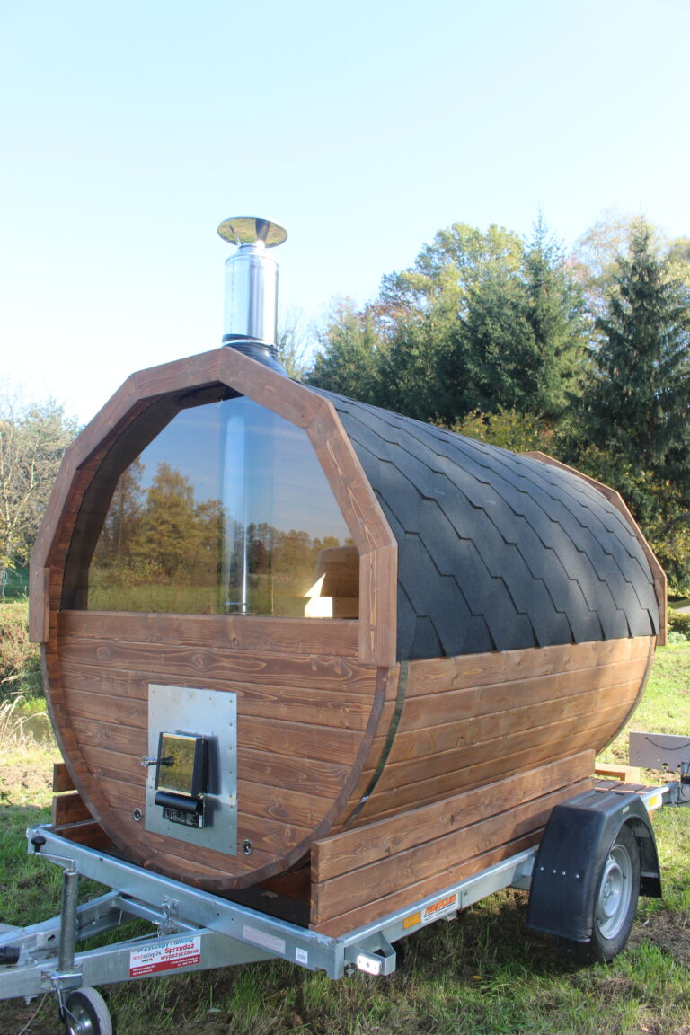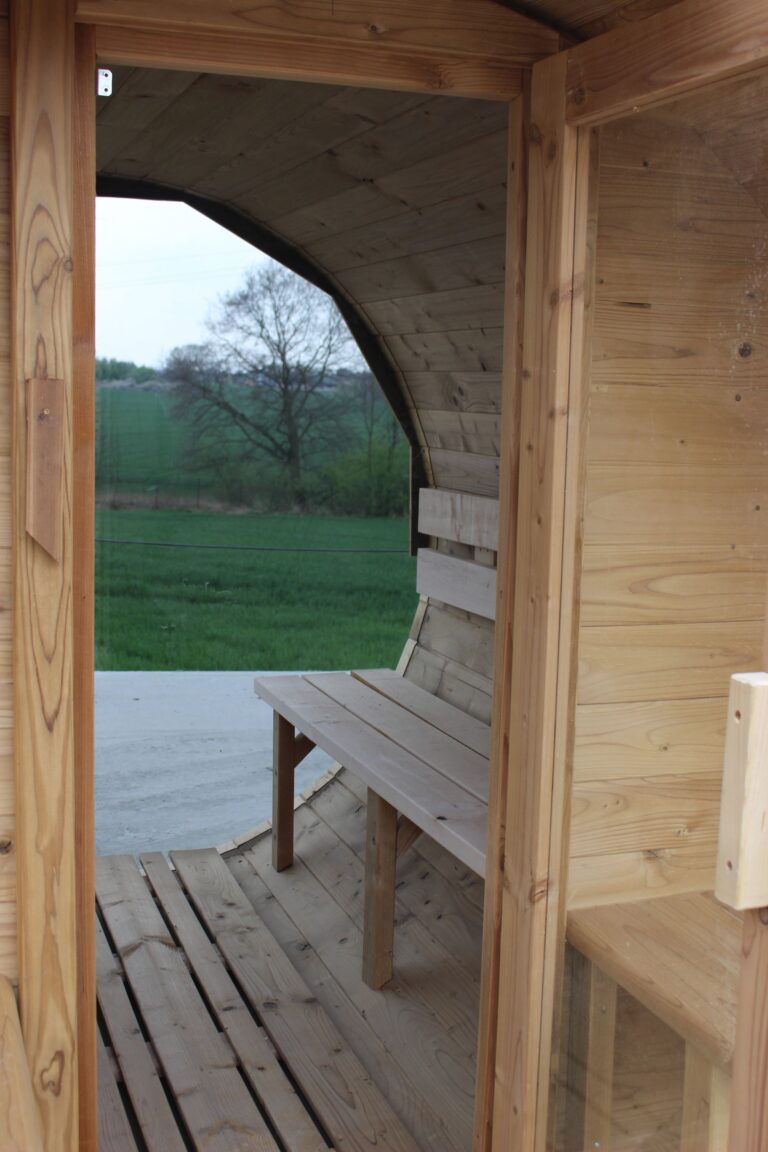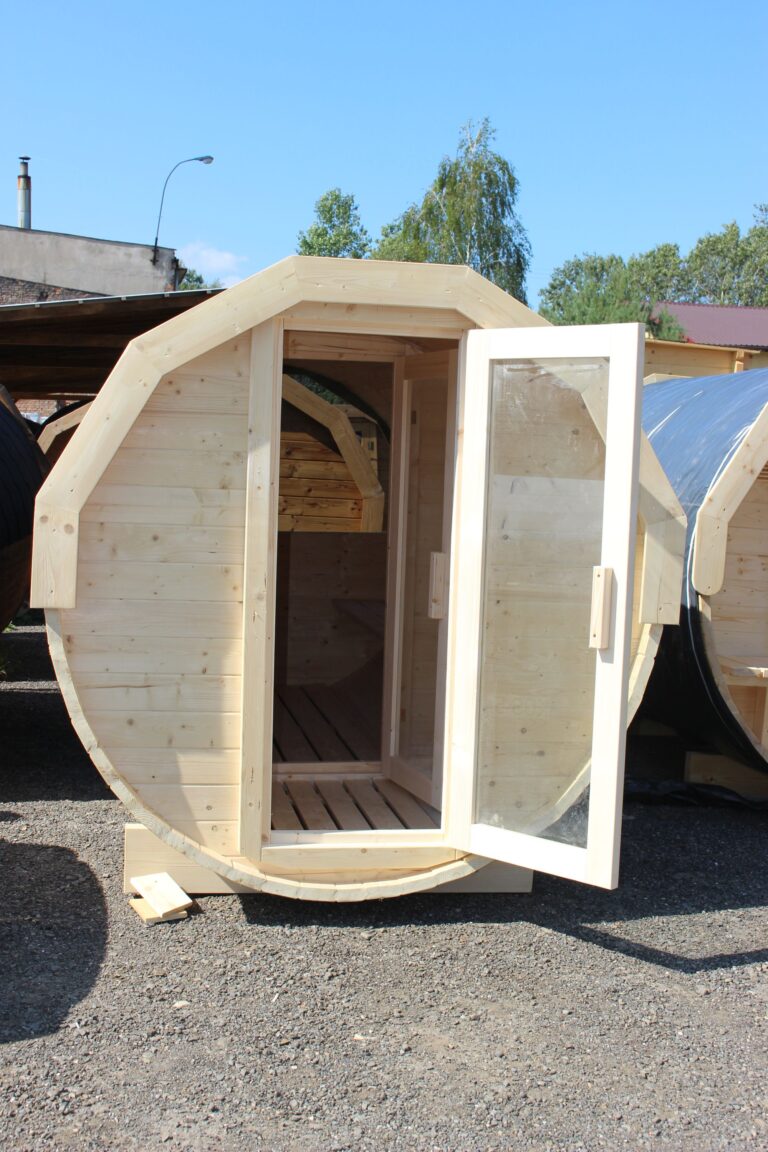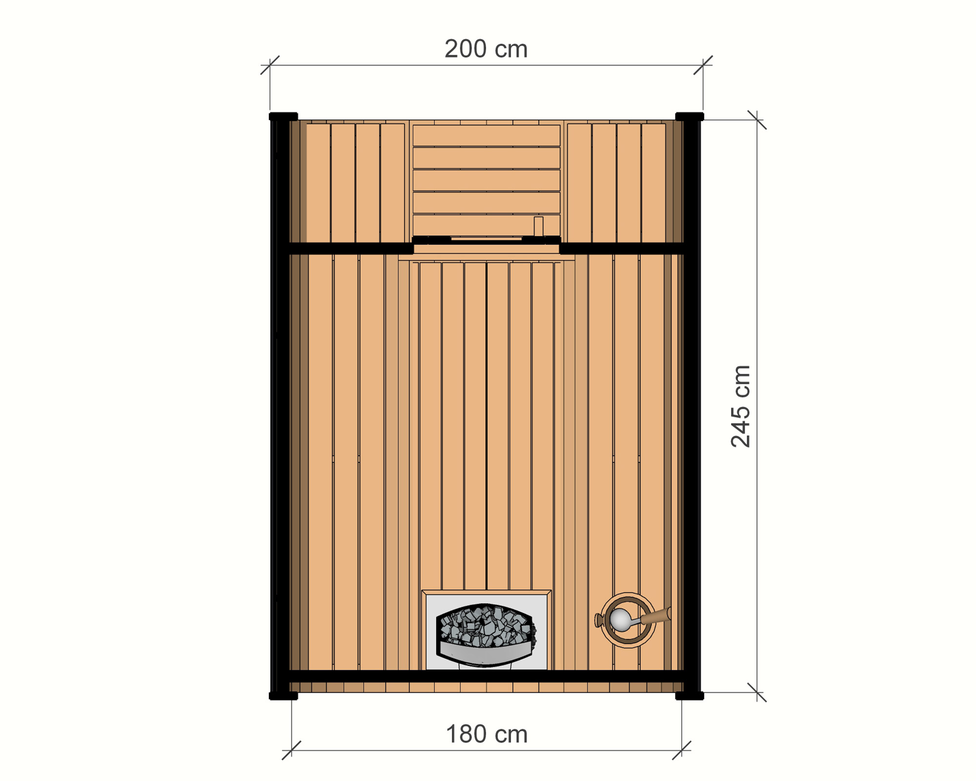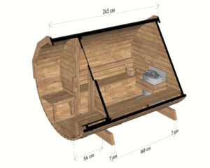 Na stavbu sauny se používá přírodní stavební materiál – smrkové dřevo pocházející výhradně z polských lesů. Celá stavba byla vyrobena ručně – podle tradičního umění zpracování dřeva. Saunu tvoří prkna tl. 45 mm, což zajišťuje optimální tepelný výkon. Naproti tomu 245 cm dél. a 200 cm výš. je ideální velikost pro společné saunování s příbuznými a přáteli. Velmi praktickým prvkem je předsíň, která se skládá ze stříšky a dvou pohodlných lavic. Do interiéru vedou dveře se speciálním sklem z tvrzeného skla. Uvnitř sauny se nachází dřevěná podlaha a lavice, které zajišťují pohodlí během sezení. Celek pokrývá střecha z asfaltových šindelů v šedé barvě. Celek pokrývá střecha z asfaltových šindelů v šedé barvě. Saunu můžete umístit na trávník, zem, terasu nebo dlažební kostky.