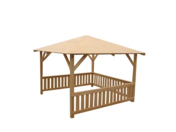 The gazebo I has dim. 3 x 3 m and 3 built-in wooden openwork panels. The construction is based on 4 load-bearing columns, each with a cross-section of 9 x 9 cm. Roof boards with a thickness of 18 mm. The height of the gazebo is 268 cm. The wood from which the structure is made is dried and planed on four sides.