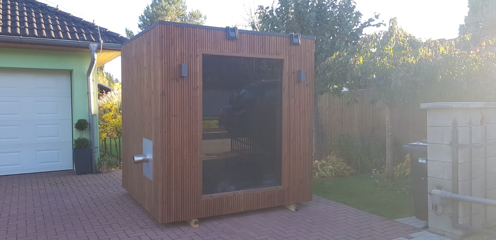 Whether you want to relax alone or with your nearest and dearest, you can easily achieve this in Sauna Premium. With a surface area of 2.2 m x 2.2 m, the sauna is spacious enough for up to 4–6 people. On the other hand, if you dream of relaxing alone, spending time in Sauna Premium can feel peaceful and intimate. This is all thanks to the front wall made of tinted tempered glass. It allows you to observe your surroundings without any problem, but no one is able to notice that you are spending time inside.