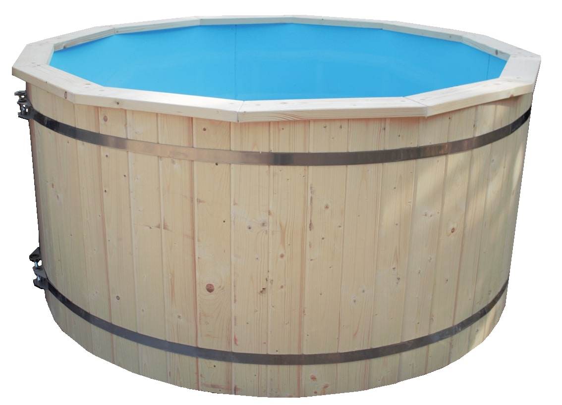 This is a large larch garden hot tub with a diameter of 200 cm equipped with a plastic insert and an external stove. It is a pleasant and relaxing springboard from stressful work.