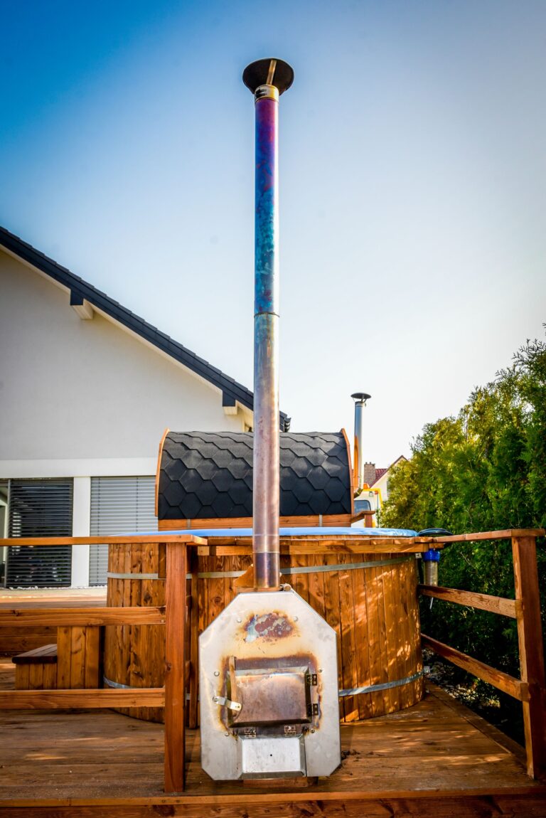 Placing the hot tub in the garden can be a great idea for a family picnic or a meeting with friends, because it can accommodate up to 6 people, and is equipped with a metal external wood-burning stove. Wooden stairs, a bench and a cover are also provided.