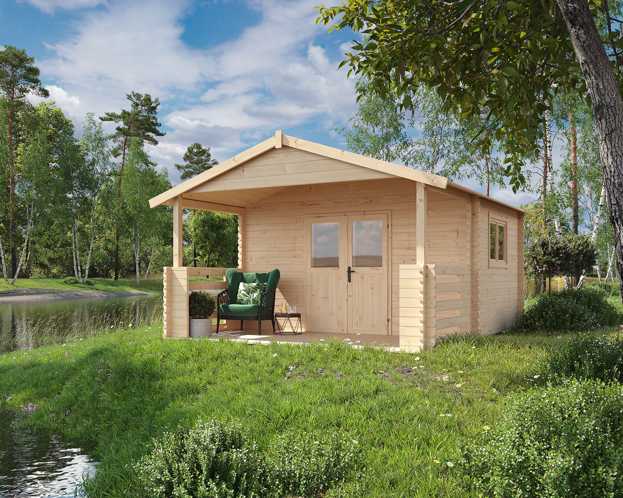 The summer house is a handmade from spruce wood from Polish forests with wood moisture of 18%. The structure includes a terrace and basic equipment. The garden house from A&M will work well on a plot, in a garden and as an accommodation place.