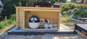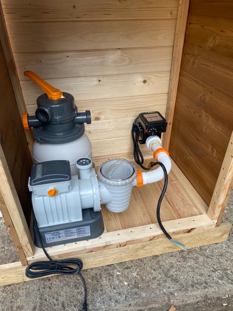 The pool from A&M includes steps, a ladder, a sand filter (6 m³/h) and the possibility to add an external wood stove or 4kW heat pump.