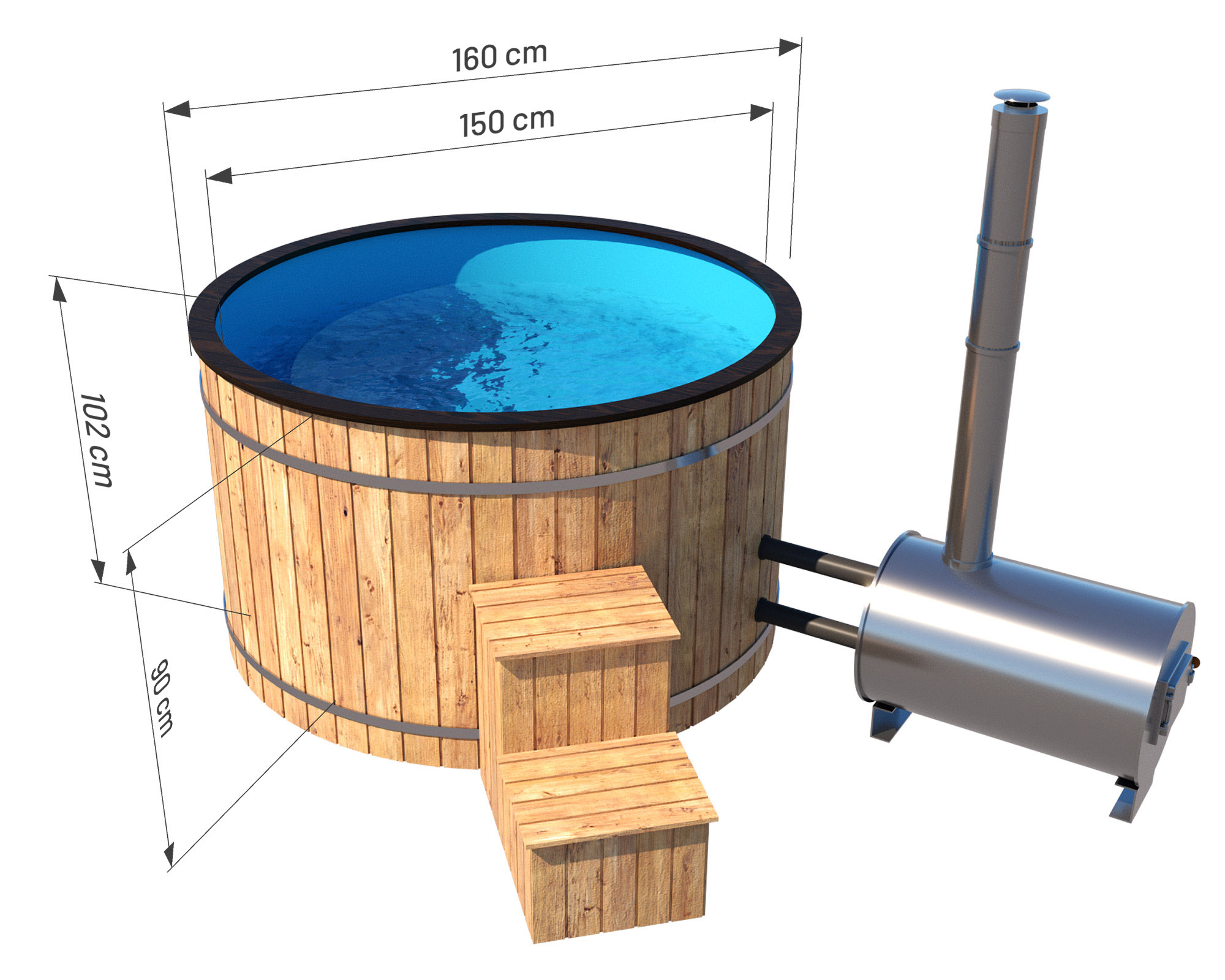 Balia ogrodowa 160 cm o pojemności 1000 litrów pozwoli na miły relaks w towarzystwie bliskich i przyjaciół, ponieważ rozmiar umożliwia korzystanie aż 4 osobom. Do balii 160 cm można wejść po drewnianych schodkach, a następnie usiąść na wyprofilowanym siedzisku. Po kąpieli możliwe jest zabezpieczenie balii drewnianą pokrywą dołączoną do zestawu.