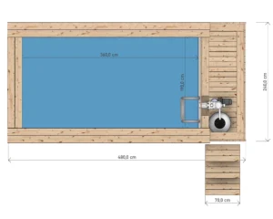 Wymiary basenu to 480 x 240 cm. Deski obudowy basenu posiadają 44 mm grubości. Drewno odporne – poddane suszeniu komorowemu. Pojemność 6840 litrów.
