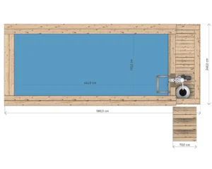 Wizualizacja basenu o wymiarach 4.8 x 2.3 m z piecem i wkładem, model Thermo, widok z perspektywy. Bez impregnacji