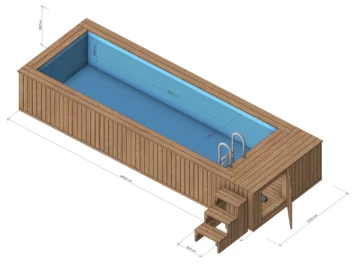 Wizualizacja basenu o wymiarach 4.8 x 2.3 m z piecem i wkładem, model Thermo, widok z perspektywy. Bez impregnacji