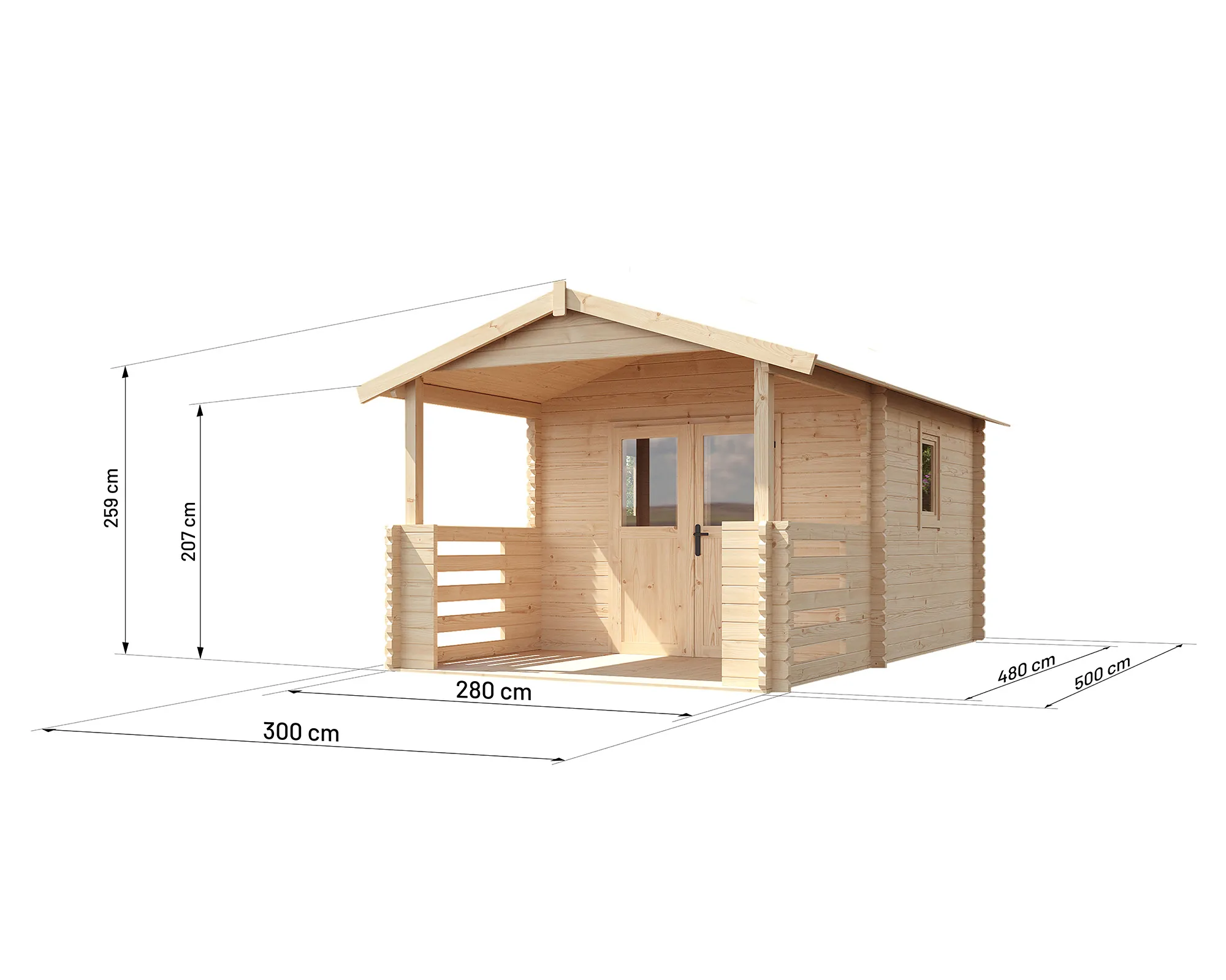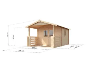 Domki letniskowe od A&M są wytwarzane w tradycyjny sposób – to ręczna robota. Za surowiec służą szlifowane i strugane czterostronnie deski wykonane z naturalnego drewna świerkowego o wilgotności 18%. Dużą zaletą domku jest zadaszony taras o pow. 6 m² oraz przytulne wnętrze o wym. 3 x 3 m. Obiekt przykrywa dwuspadowy, deskowany dach, zaś dostęp do światła słonecznego zapewnia jednoskrzydłowe okno z szybą o gr. 3 mm, a dostęp do wnętrza dwuskrzydłowe drzwi z pojedynczą szybą, zamkiem i klamką. Na podłodze, tarasie i dachu znajdują się deski o gr. 18 mm, natomiast ściany mają 34 mm grubości. Na uwagę zasługuje ergonomia oraz naturalność konstrukcji. Dostawę domku realizujemy na palecie transportowej. Całość złożysz przy pomocy drugiej osoby i podstawowych narzędzi.