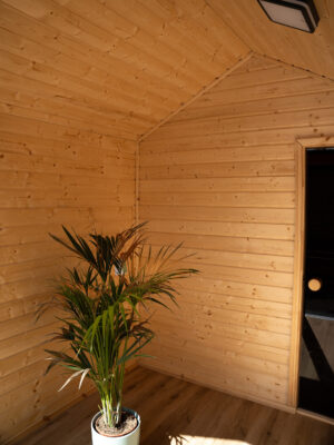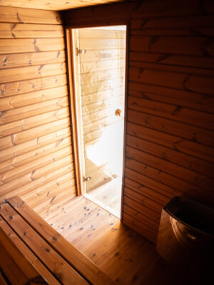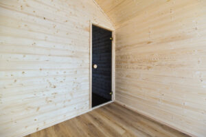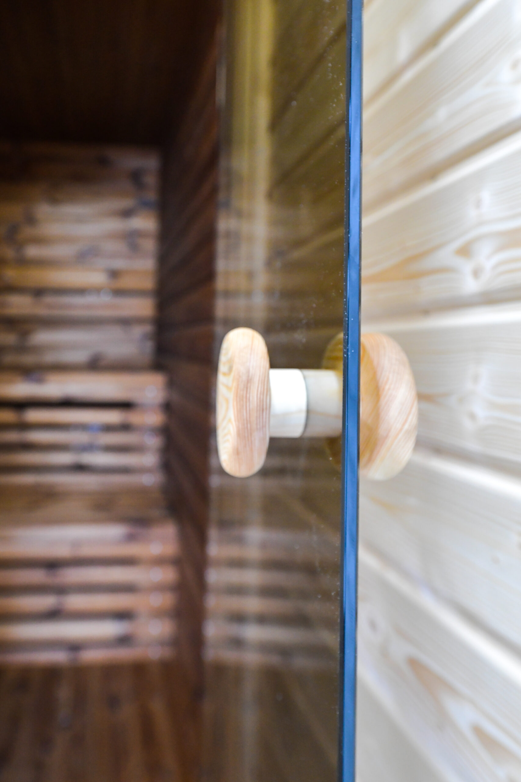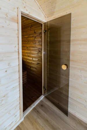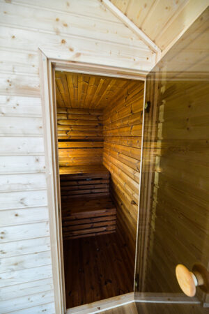 - Z zestawem saunowania – Kompletny zestaw akcesoriów: drewniany cebrzyk i chochla do polewania kamieni, klepsydra do odmierzania czasu oraz termometr z higrometrem do monitorowania warunków w saunie.
