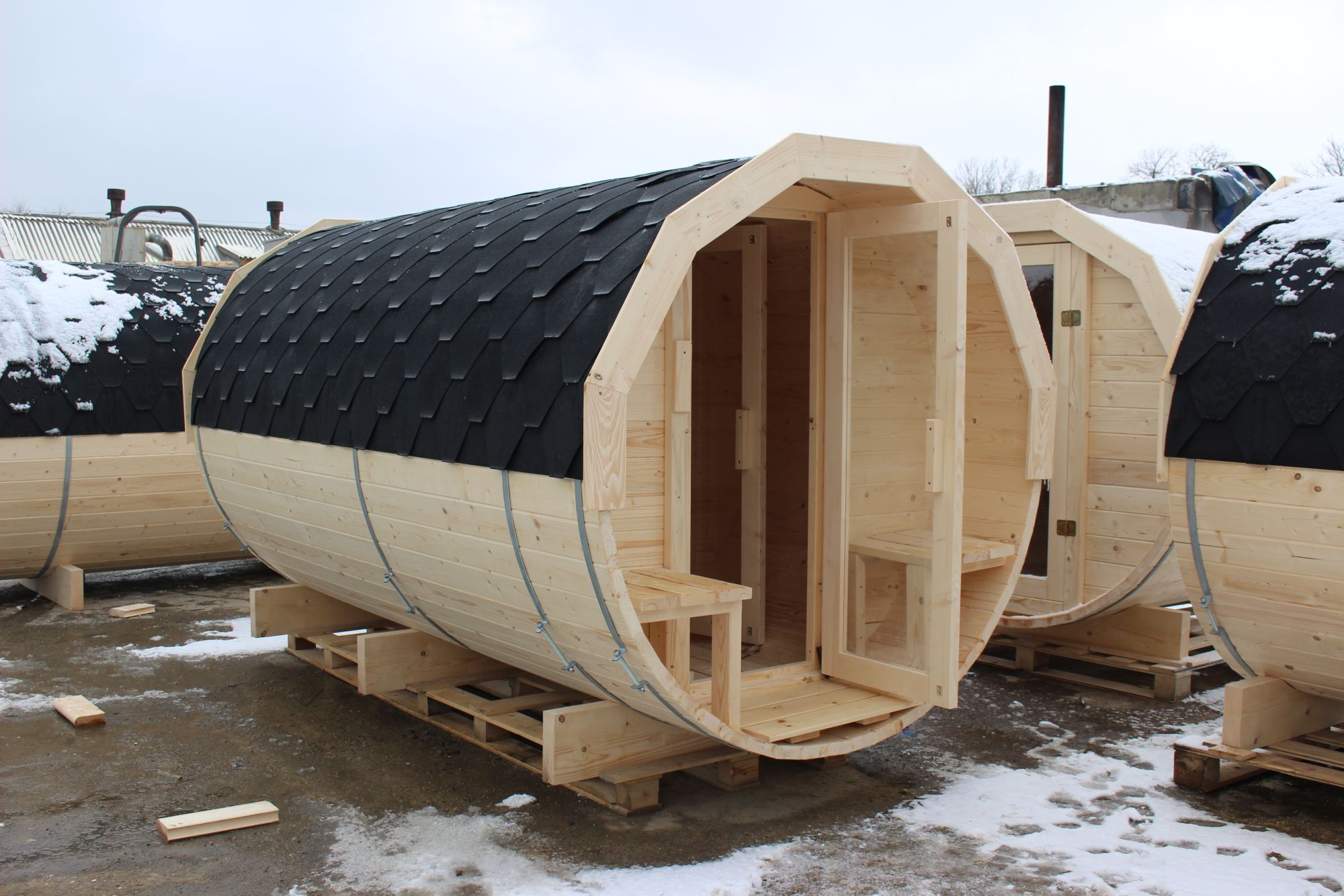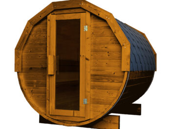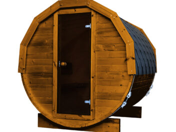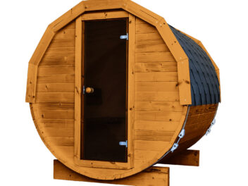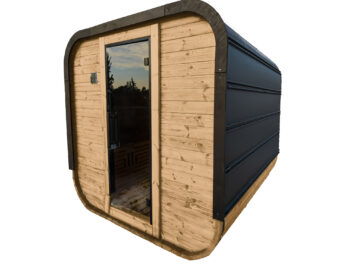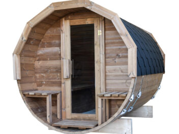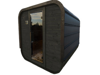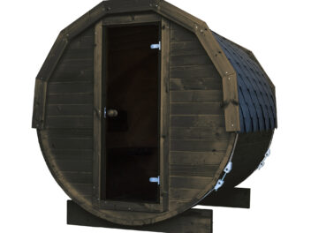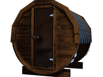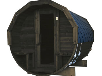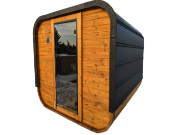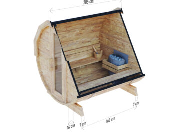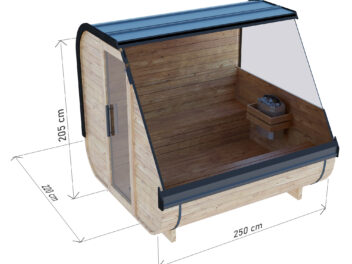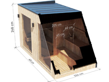 Sauna została stworzona przez pasjonatów i wykonana z wyselekcjonowanych desek o gr. 45 mm, które powstały z drewna świerkowego. To naturalny materiał, który jest wolny od szkodliwych substancji. Konstrukcja jest duża, ponieważ ma aż 350 cm dł. oraz 200 cm wysokości, a do tego posiada funkcjonalny przedsionek z ławeczkami. Pozwala to na wygodne saunowanie dla kilku osób. Do wnętrza prowadzą drewniane drzwi z przeszkleniem w postaci hartowanego szkła. W środku znajdują się wygodne ławki oraz specjalna podłoga, wszystko z drewna. Z kolei całość przykrywa drewniany dach pokryty szarym gontem bitumicznym. Konstrukcja stoi na 3 drewnianych podstawach oraz jest zabezpieczona 4 metalowymi obejmami.