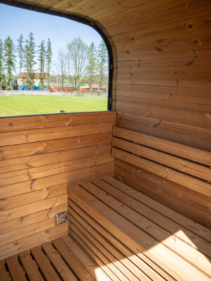 - Z zestawem saunowania – Kompletny zestaw akcesoriów: drewniany cebrzyk i chochla do polewania kamieni, klepsydra do odmierzania czasu oraz termometr z higrometrem do monitorowania warunków w saunie.