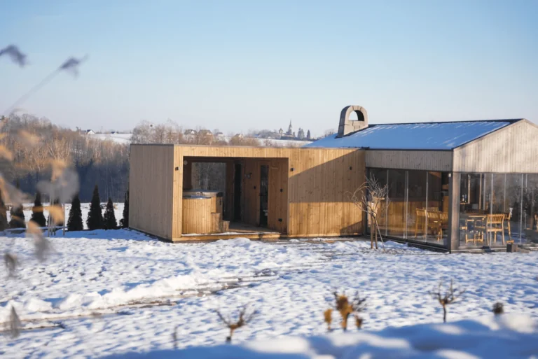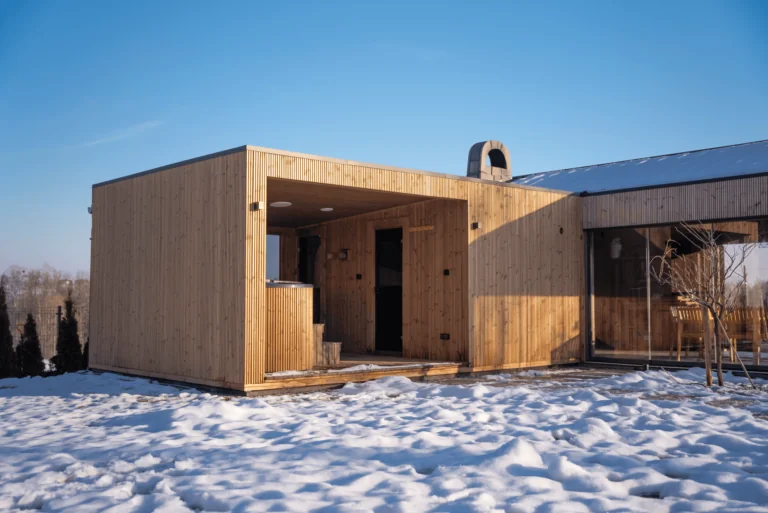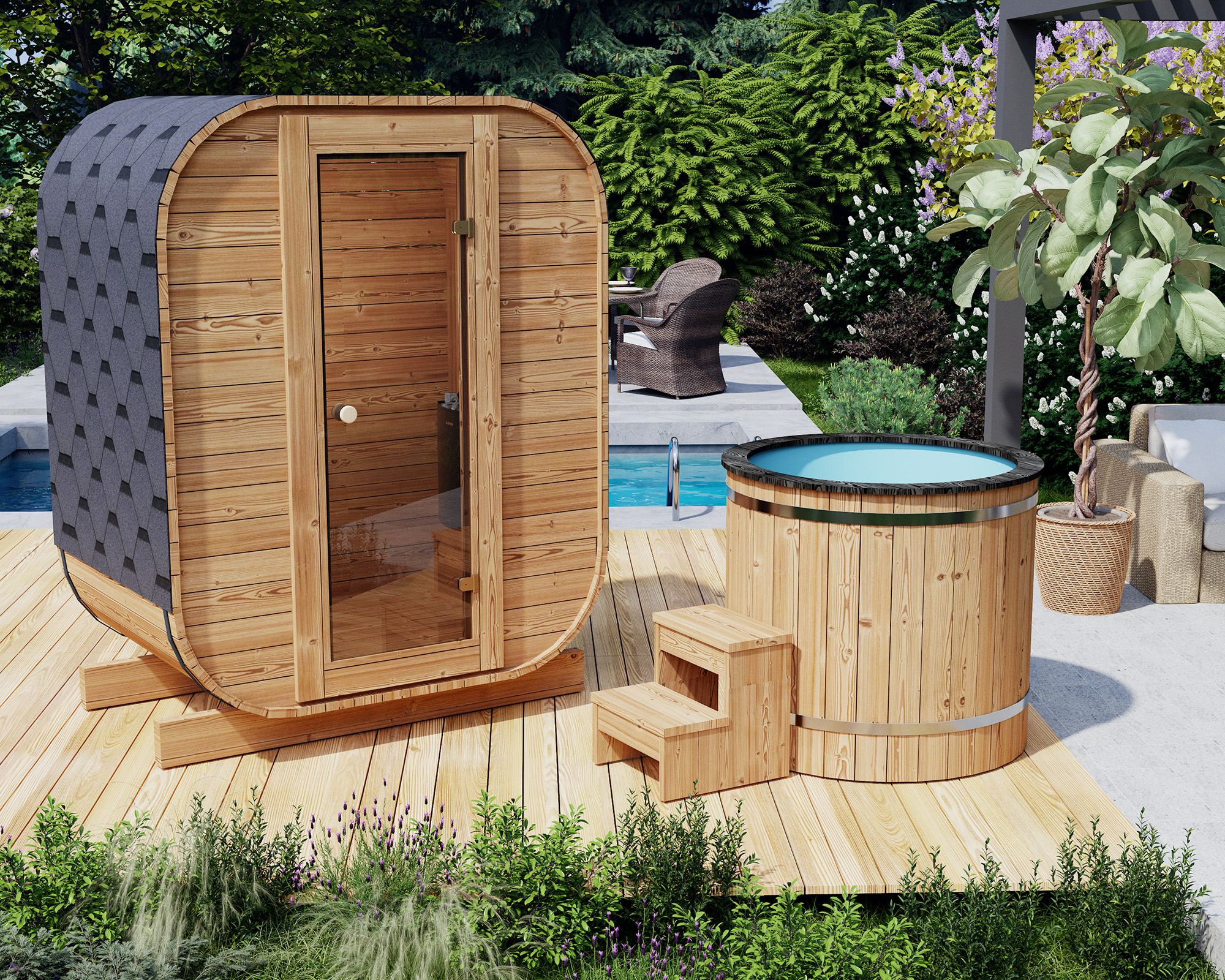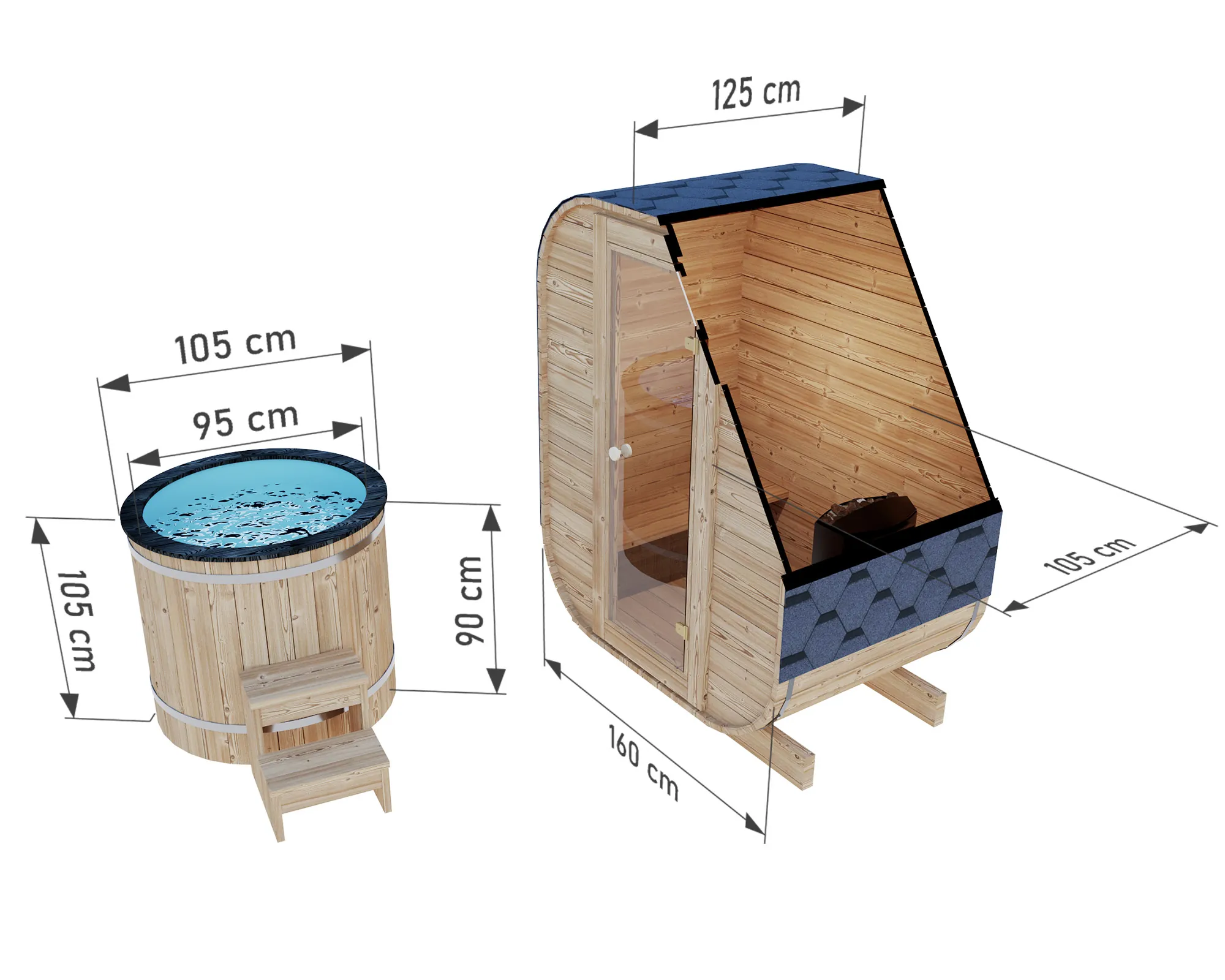 Sauna je celá vyrobená z termo dreva, 45 mm hrubých polien. Strecha je pokrytá šedým bitúmenovým šindľom a dvere sú zasklené tónovaným, tvrdeným sklom. Náš najmenší model sauny je perfektným riešením pre páry. Zmenšenie plochy miestnosti prispieva k efektívnejšiemu procesu vykurovania. Sauna je vybavená kachľami Harvia Vega BC45 s výkonom 4,5 kW. Chladiaci sud obsahuje vložku z polyesterovej živice potiahnutú termo alebo smrekovcovými doskami. Súprava obsahuje farebne zladené drevené schodíky.